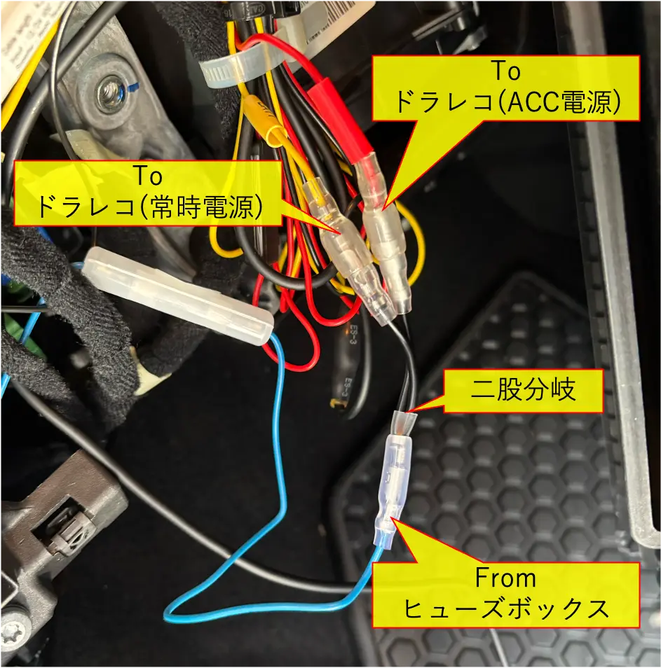 上記の画像はシガーソケット用の電源(ACC電源)から電源を取り出しています。