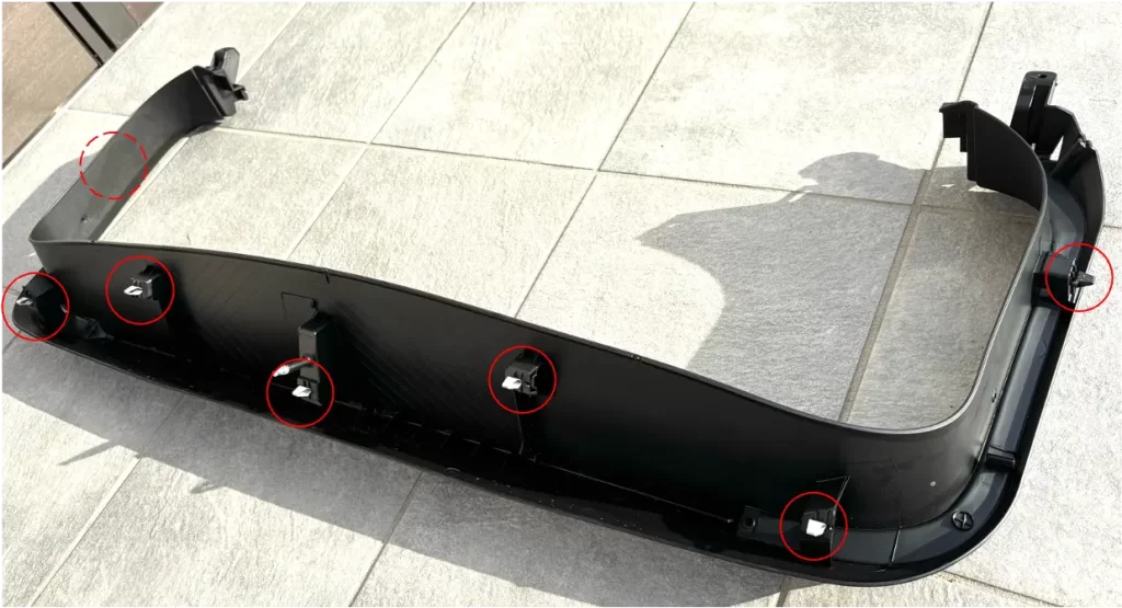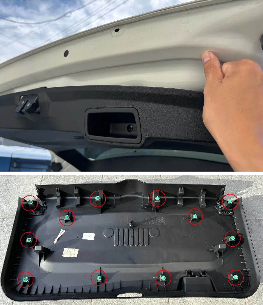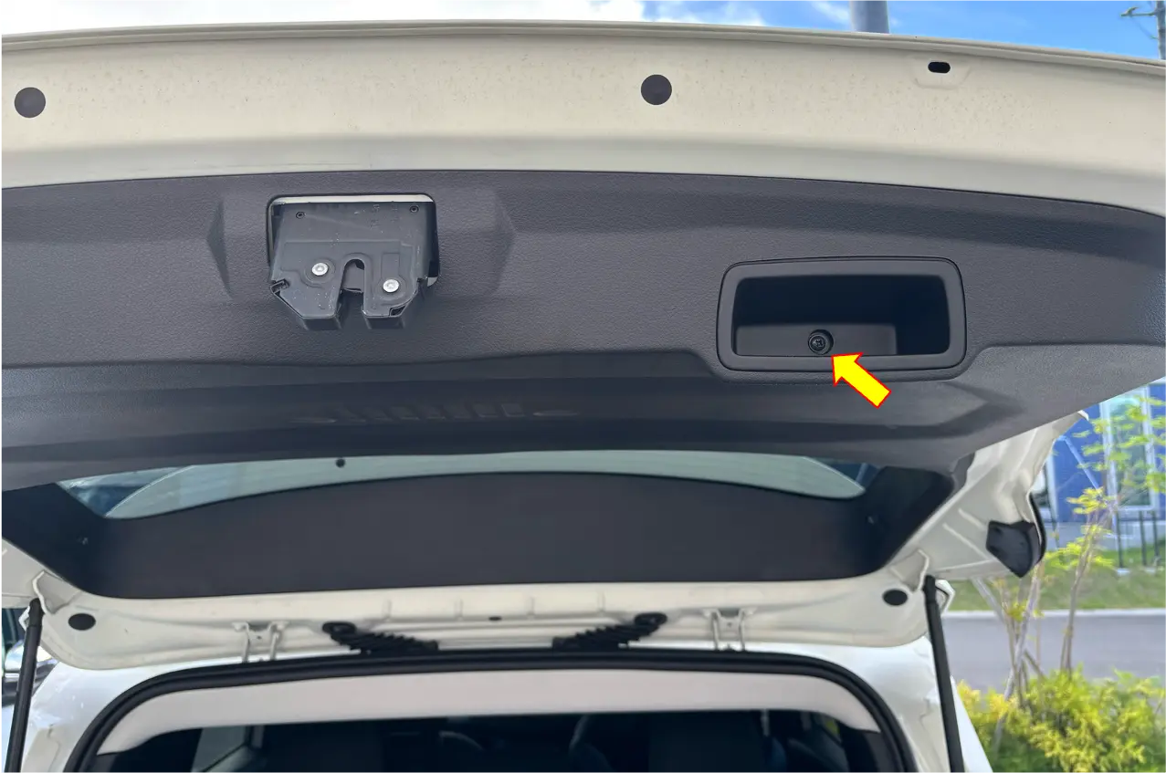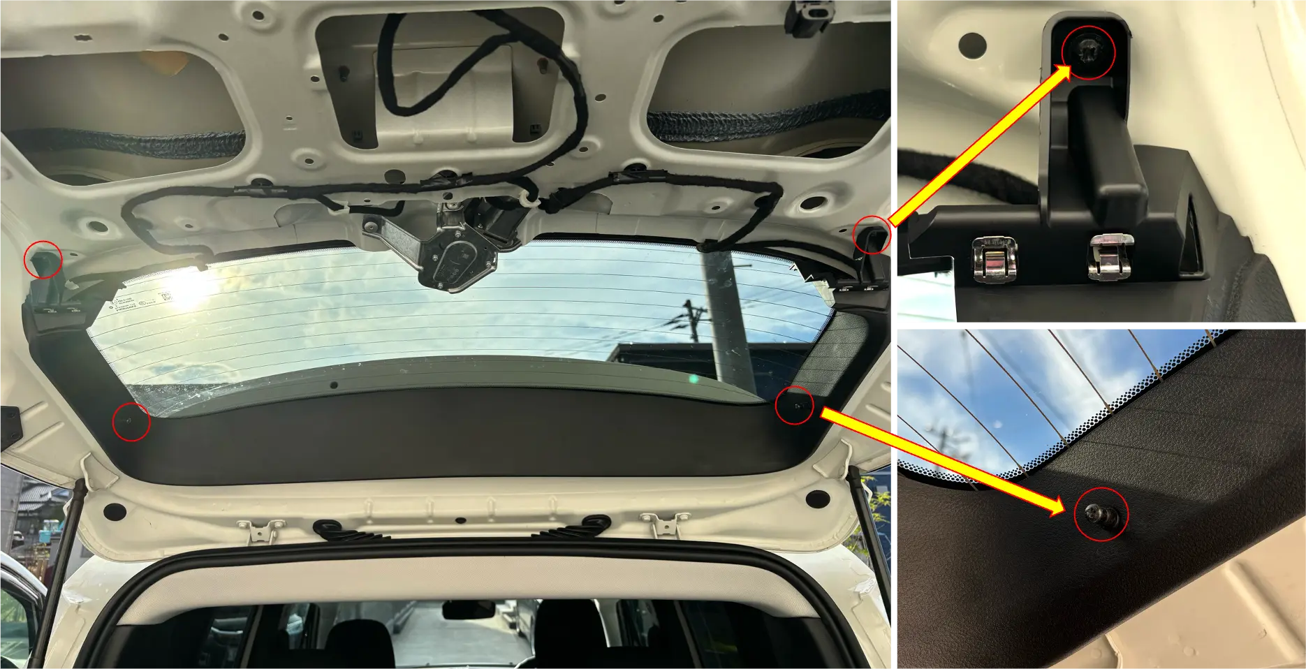 レネゲードのバックドアのパネルは、手前(バックドアを閉じた時に地面側)を先に取り外し、その後に奥(バックドアを閉じた時に天井側)を取り外します。